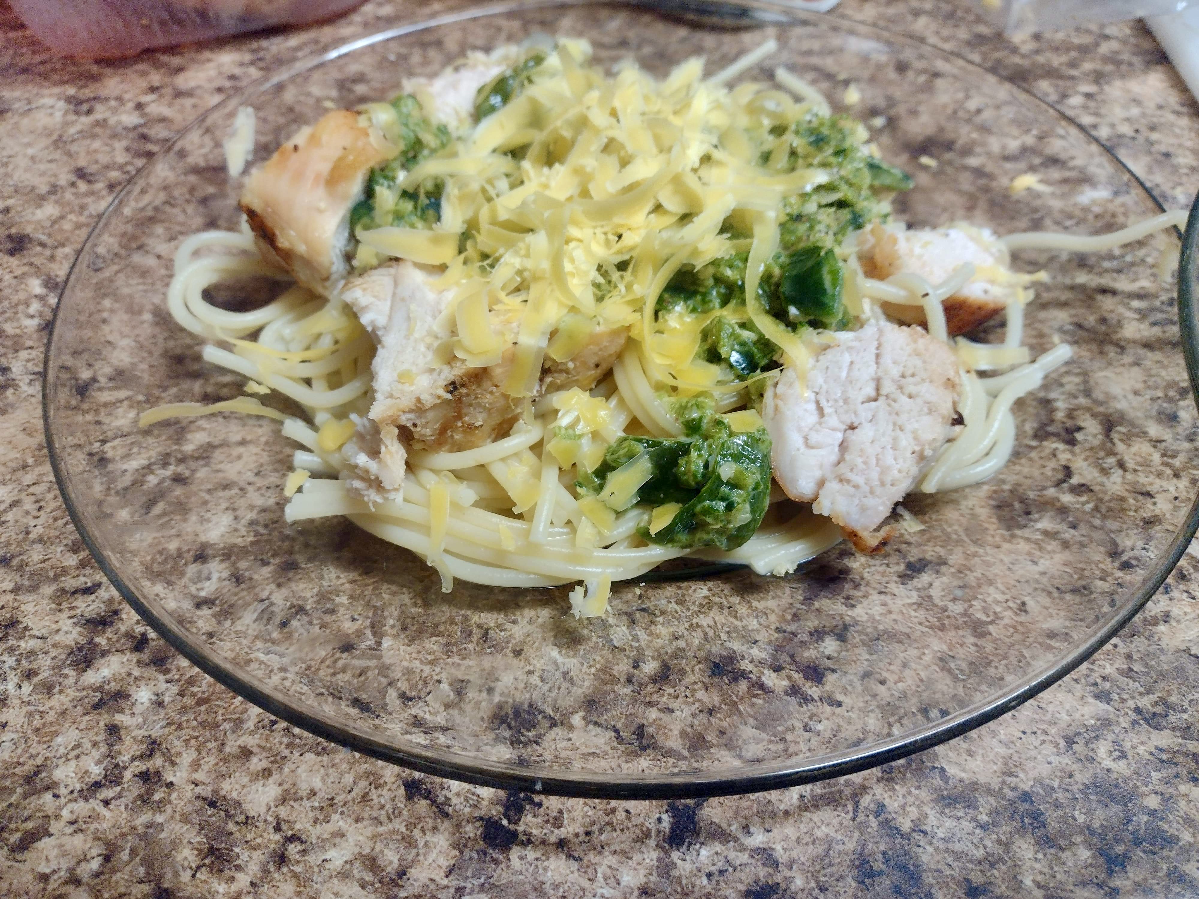 In a large pan, fry the chiles that were set aside for a few minutes, add sauce and noodles. Mix together and cook 5-10minutes.